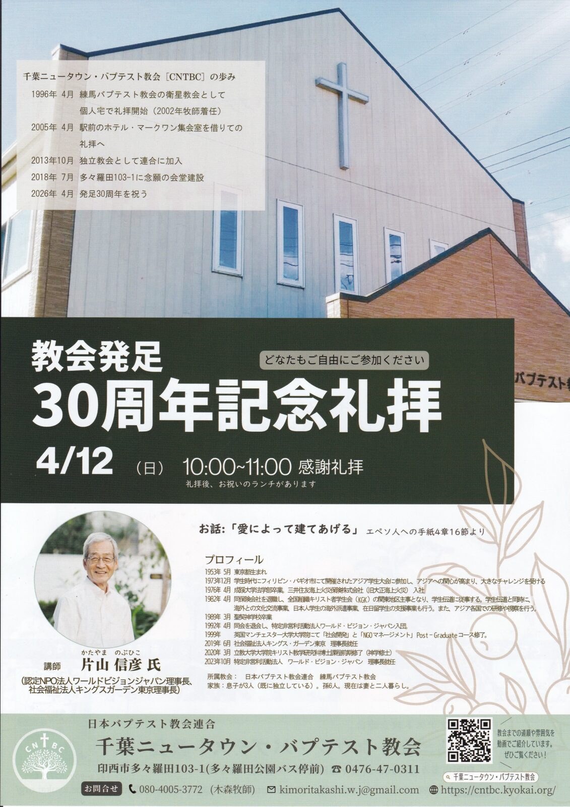 スライド字幕付き礼拝説教 2026年4月12日 教会発足30周年記念礼拝 片山信彦先生「愛によって建てあげる」(エペソ4:16) 聖書を学ぶ人のためのキリスト教説教 千葉ニュータウン・バプテスト教会
