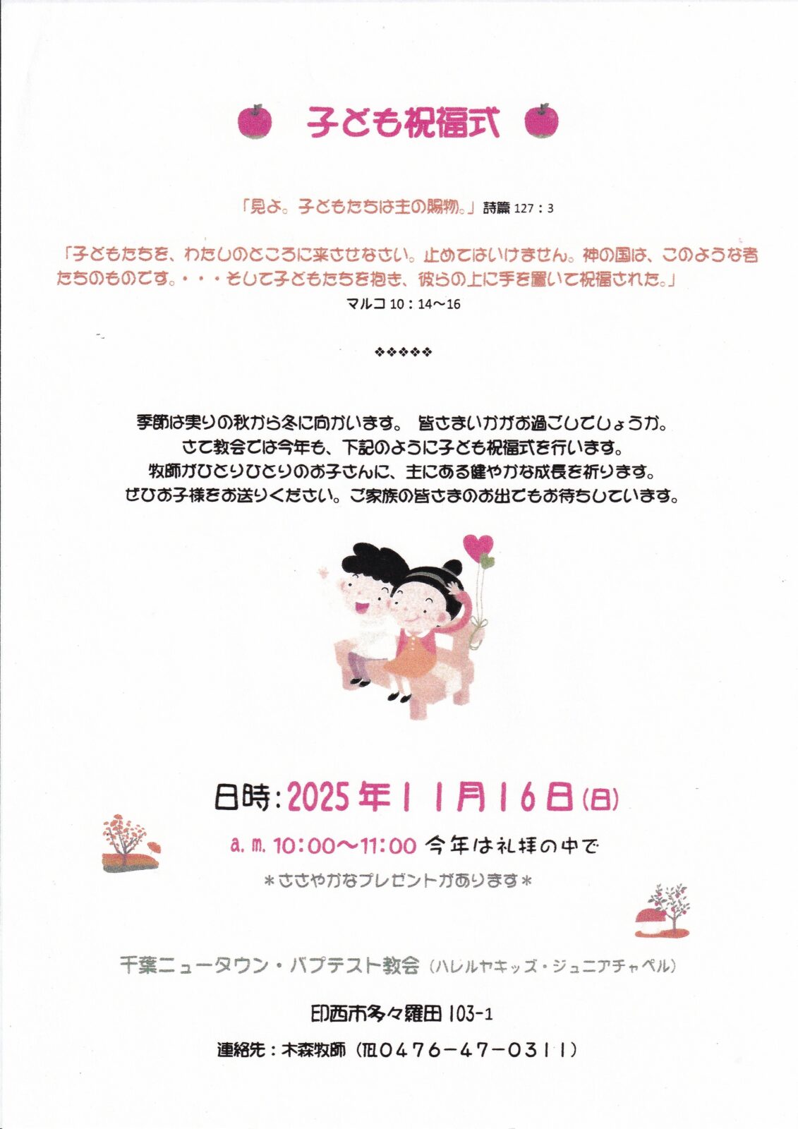 来たる日曜日の礼拝は、子ども祝福礼拝です。これは、ここ数年ジュニアチャペル(9時から30分ほど)の時間に持たれていた子ども祝福式を、今回、10時からの主日礼拝のなかで行なうものです。