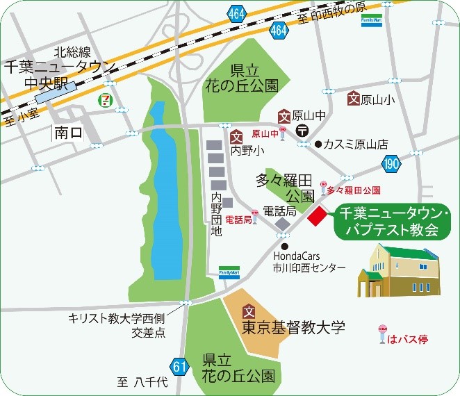 車の場合印西市の「キリスト教大学西側」交差点から、